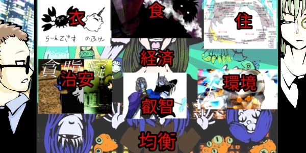 サ「生産は異形達の圧倒的且つ気紛れな生産力を主軸に、ヒト等が巧く資金繰りしてます。なので自給率は凡そは把握していても明確な数値は誰も出したがりませんわ。あと無法者違反物は当然多いですけど、命が金替わりって層も結構いますからねえ。でも一線超えないよう、叡智を頼りにしていたりするのでご了承を。」