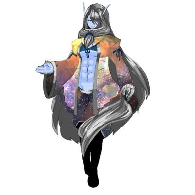 カルメルタザイト旧衣装全身図。服には宇宙が映っているらしい。横髪を正面側で結う髪型。足元のデザインは赫怒の牙を意識したもの……