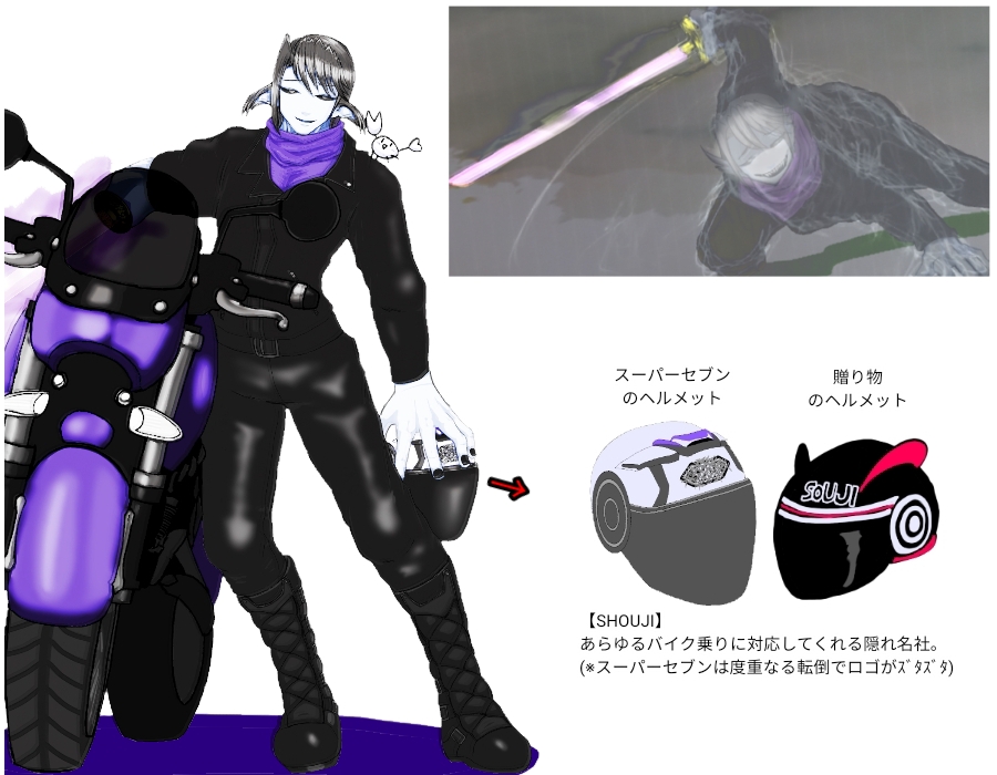 スーパーセブン全身図。真っ直ぐ背を伸ばすことは出来なくはないが滅多にない。真っ黒なバイクライダースーツを身に纏う。人前ではフルフェイスヘルメットを被り手袋も装着する。