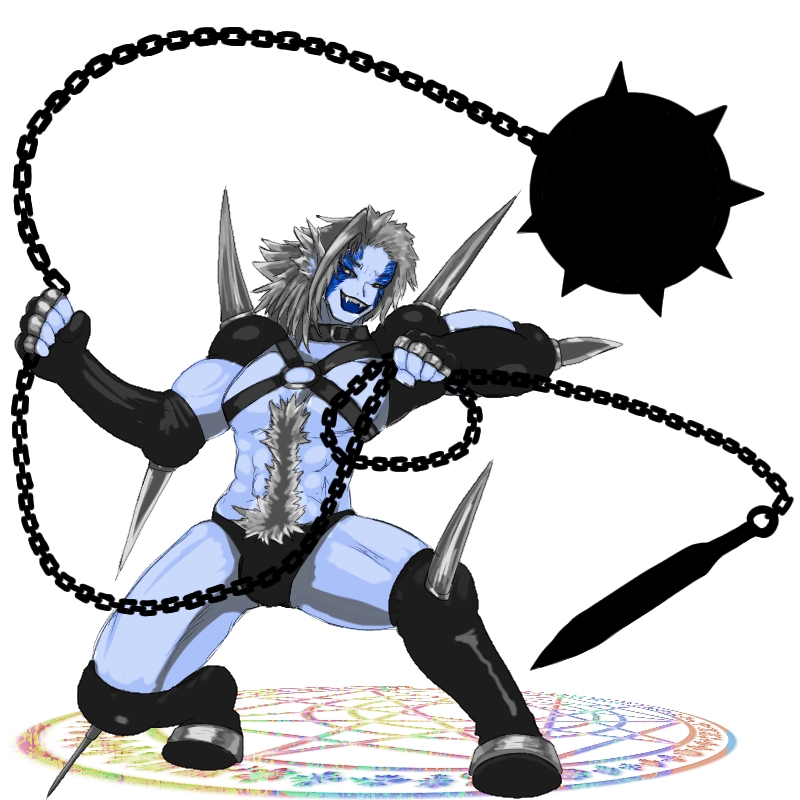 ユークレース全身図。下賤の者の格好をしつつ鉄球を振り回す。恥じらいなどない。というかこういう趣味なのだろう。体が大きくなり続けているのは、ターフェアイトが彼の知らない所で人肉を喰わせているからだ。
