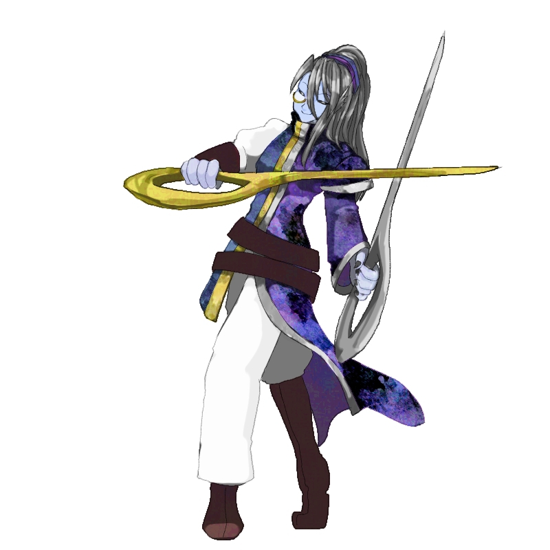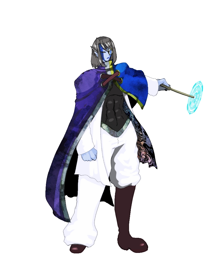竜王ユークレース全身図。軍師だがその知略性を評して竜王と呼ばれていたそうな。このモノクルと青紫の衣装はターフェアイトが拵えた物らしい。あとストレートに仕立て上げられたヘアーも。