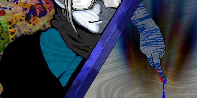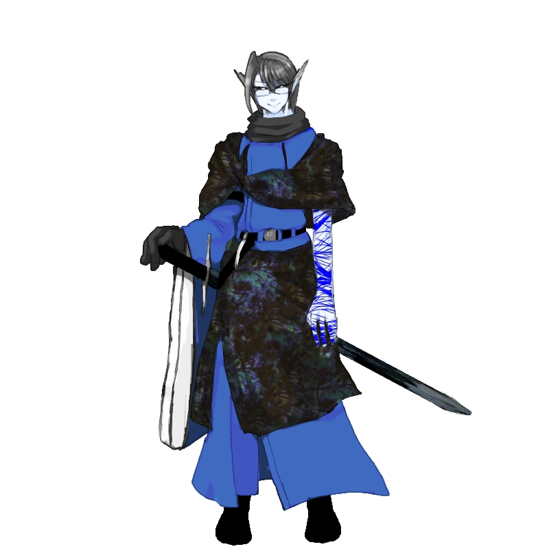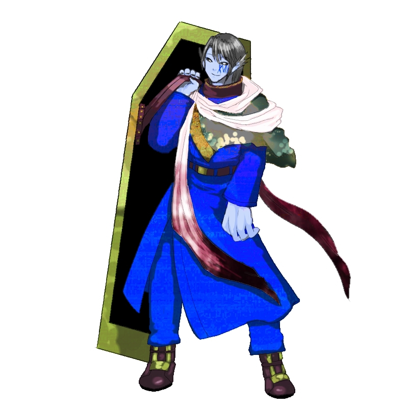 ルチル全身図。強烈な異能力者ゆえに判別しやすいようにとⅩⅦを頬に刻まれた。貴族からの高級スカーフと、血を拭うためのスカーフを身に付ける。棺桶の中には貰い受けた貴重品や武器や遺体が収納されている。